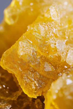 Macro shot of golden cannabis crystals, highlighting their glistening texture