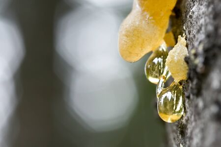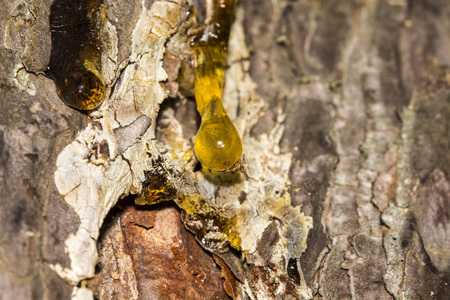 drops of amber pitch flow down on tree.
