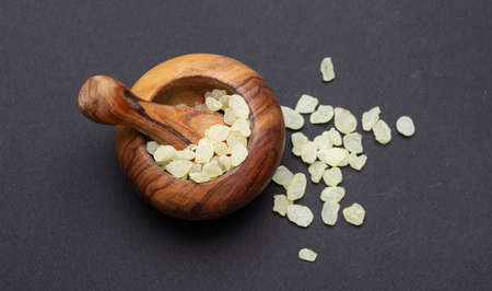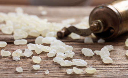 Mastic sakizi resin tears. Chios mastiha on a wood background, closeup vertical view