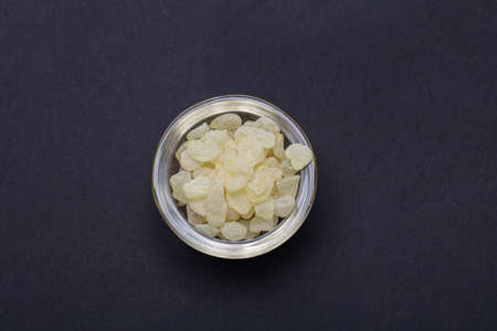 Mastic resin tears. Chios mastic in a glass bowl isolated on black background