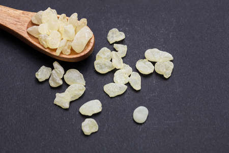Mastic resin tears. Chios mastic isolated on wood background, closeup view