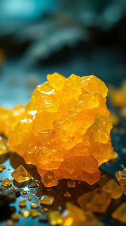 Golden amber candies on a dark reflective surface background