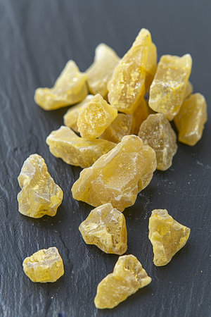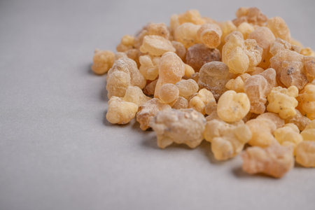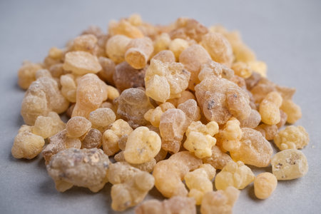 Macro Still Life of Natural Pale Yellow Frankincense Resin Tears (Boswellia sacra) Used for Incense, Aromatherapy, and Herbal Medicine.