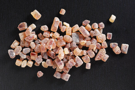 Heap of large caramelized sugar on black stone background, top view