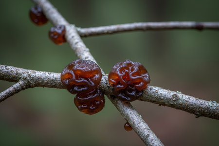 Amber jelly fungus clusters cling to a textured tree branch, showcasing intricate natural formations against a soft green woodland background