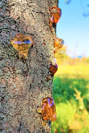 Amber resin on the bark of a tree. Close-up.