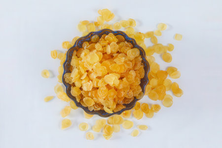 Yellow raisins in a bowl on a white background, top view