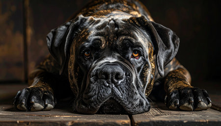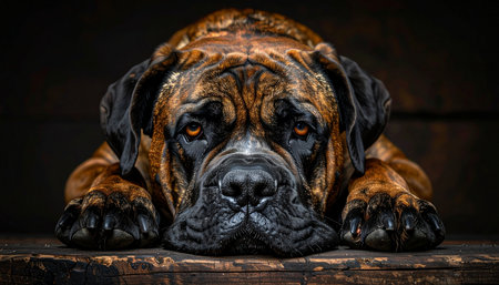 A majestic brindle mastiff rests its heavy head on a rustic wooden floor. Its soulful, somber eyes gaze forward, conveying a sense of deep loyalty, quiet strength, and patient waiting. The dramatic lighting highlights every wrinkle and the powerful build of this gentle giant.