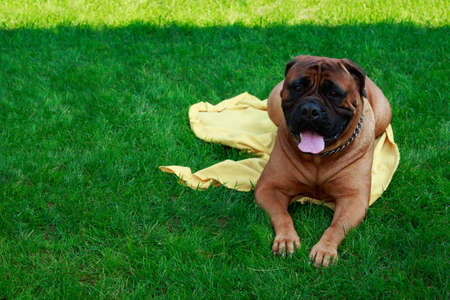 cute breed of brown dog with a blurry green background. Dogue de Bordeaux playing with its owner in the garden.