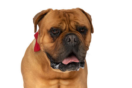 portrait of elegant bullmastiff dog with red bowtie panting and drooling on white background in studio