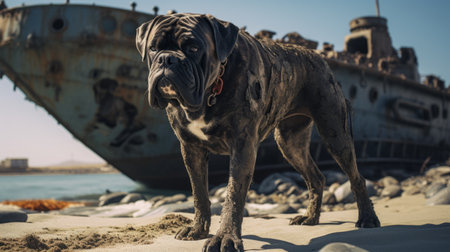 a brown dog stands next to an old rusty boat, creating a post-apocalyptic backdrop. captured with the sony fe 85mm f/1.4 gm lens, this photo showcases snapshots of iconic hollywood stars and hyperrealistic marine life. the close-up shot highlights the dog's features against the light gray and navy tones, while the creased, crinkled, and wrinkled textures add depth to the image. ai generated