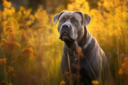 Cane corso dog sitting in meadow field surrounded by vibrant wildflowers and grass on sunny day ai generated