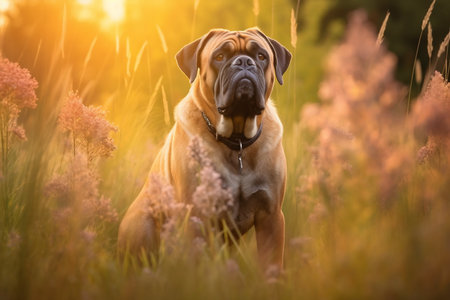 Bullmastiff dog sitting in meadow field surrounded by vibrant wildflowers and grass on sunny day ai generated