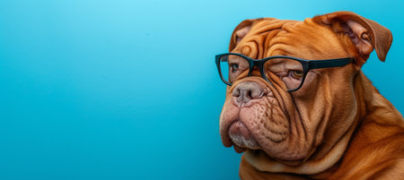 Sophisticated dog with big glasses on blue background, plenty of space for text.