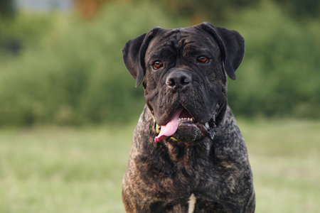 A stoic Italian Cane Corso dog gazes forward, its tongue lolling to the side