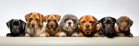 Diverse group of dogs, various breeds and sizes, white background, high quality studio shot