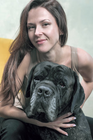 Young slender cute girl with a dog of the Italian breed Cane Corso portrait in the studio