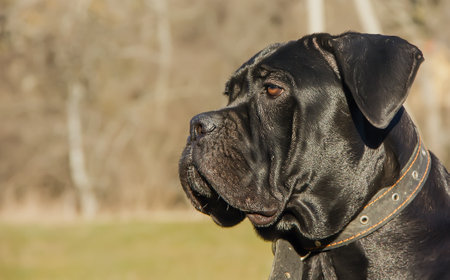 Black beautiful dog breed Cane Corso on a clear day. place for text