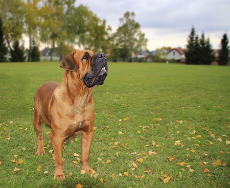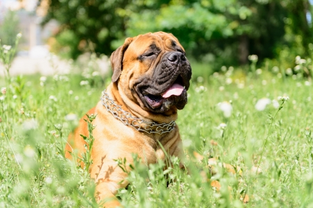 Portrait of a large brown Bullmastiff dog looking away while sitting on the grass of park in urban surroundings