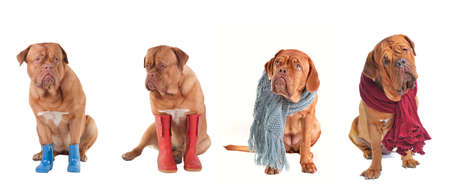 Four Dogs Dressed in Winter and Autumn Clothes isolated on white background