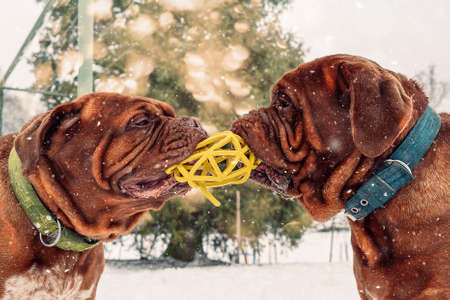 French Mastiff. Bordeaux dog. Big dog playg. Winter and snow.