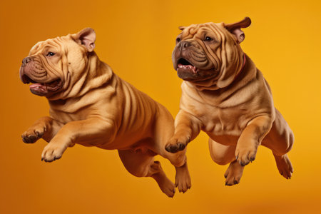 Jumping Moment, Two Chinese Shar Pei Dogs On Yellow Background.