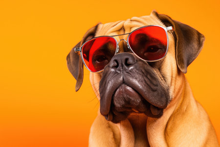 Portrait Bullmastiff Dog With Sunglasses Orange Background. Bullmastiff Breed Overview, Portrait Photography Tips, Styling Your Pet For Photos, Color Theory In Photography.