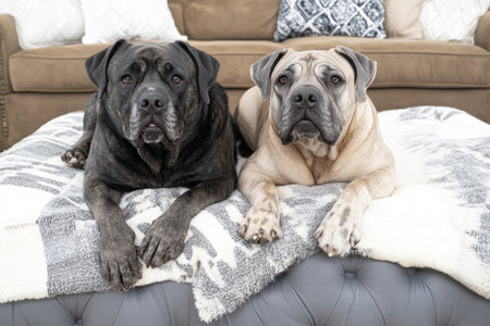 Two Large Dogs Relaxing on Cozy Blanket in Front of a Sofa.
