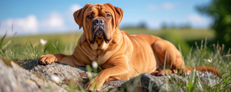 Boerboel dog sitting in meadow field surrounded by vibrant wildflowers and grass on sunny day ai generated