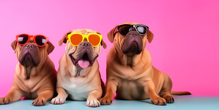 Creative animal concept. Group of shar pei sharpei dog puppy friends in sunglass shade glasses isolated on solid background, commercial, editorial advertisement, copy text space