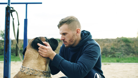 Young sporty man walking with his bullmastiff dog outdoor at nature after crossfit training