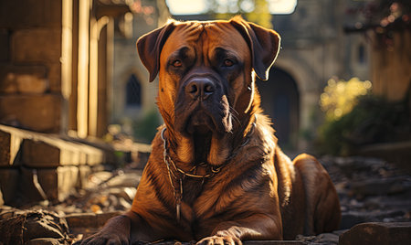 Serene mastiff dog basking in the golden light of sunset, amidst a lush green lawn.