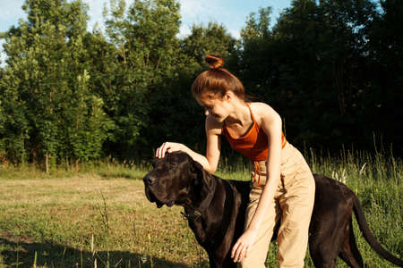 Young woman with hound dog in nature, detail of love and friendship, animal respect