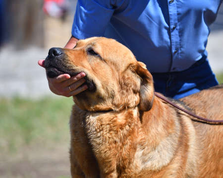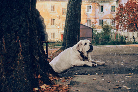 A local dog lies on the pavement and waits. An adult dog. Faithful, man's best friend. Summer sunny morning. animal