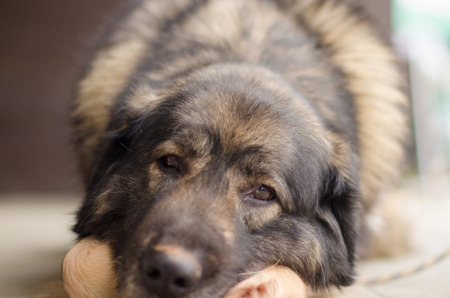 A large shaggy dog with dirty fur lies on the street. Homeless dogs in Tbilisi.