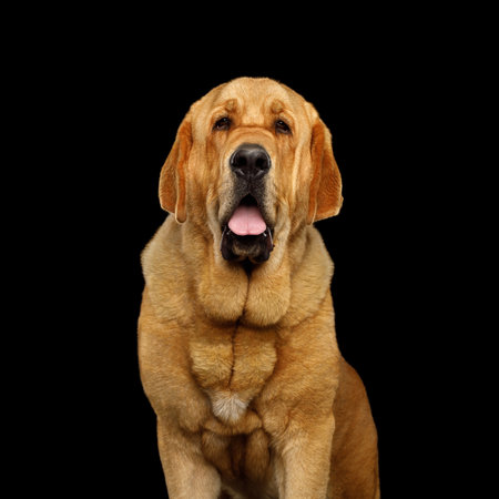 Stunning portrait of a golden Spanish mastiff dog isolated on black background, studio shot