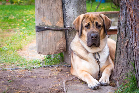 Big red dog breed Alabai lies in the garden next to a tree fastened with a chain.