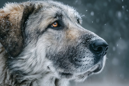 Close-up muzzle of large dog with closed eyes admiring snow in winter forest
