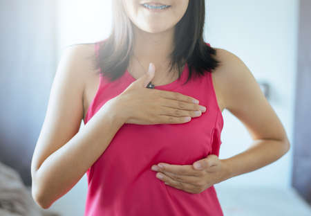 Asian woman self touching check lump or Breast cancer, Breast Self Exam.