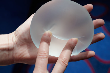 Silicone implant in hand close-up. Breast augmentation and lift surgery.