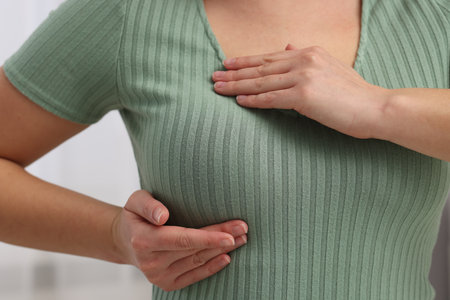 Woman performing a breast self-exam, checking for lumps or irregularities. The neutral background and soft lighting emphasize the importance of health awareness and prevention, copyspace
