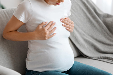 Unrecognizable pregnant lady massaging her breasts while sitting on couch at home, expectant female having painful feelings in chest area, examinating herself, cropped image with free space