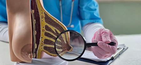 A mammologist oncologist studies an anatomical model of a woman breast using a magnifying glass in a clinic. Examination of a woman mammary glands in a clinic