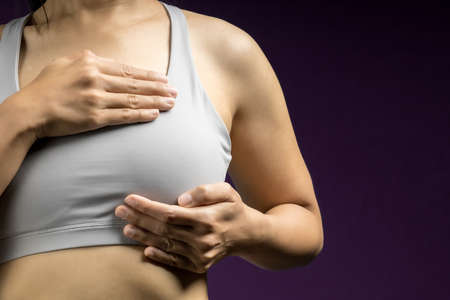 Woman hand checking lumps on her breast for signs of breast cancer on gray background. Healthcare concept.