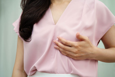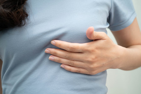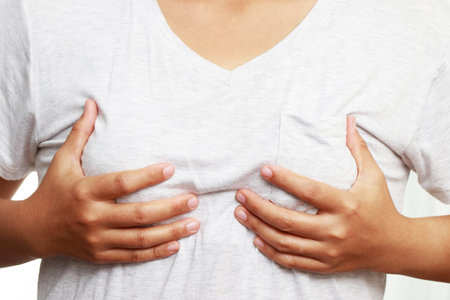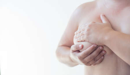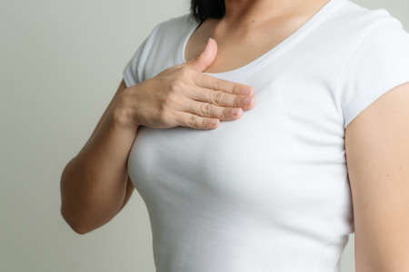 Close-up Woman hand touching her breast screening by self. female checks lump in her breast with her fist to investigate for breast cancer herself. Have chest pain.