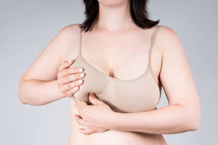 Breast test, woman in beige bra examining her breasts for cancer on gray studio background