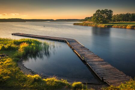 Footbridge on Lake Kirsajty during the sunset, Masuria, Poland