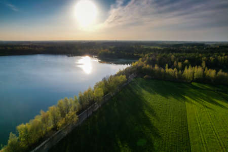 Aerial view of countryside and lake in the evening at sunset light. Beautiful nature landscape