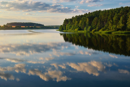 Beautiful tranquil lake with cloud reflection. Reservoir Petrovichi on the Volma river, Minsk region, Belarus.