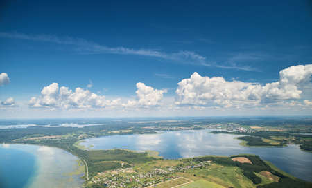 Naroch lake aerial drone view landscape in bright day